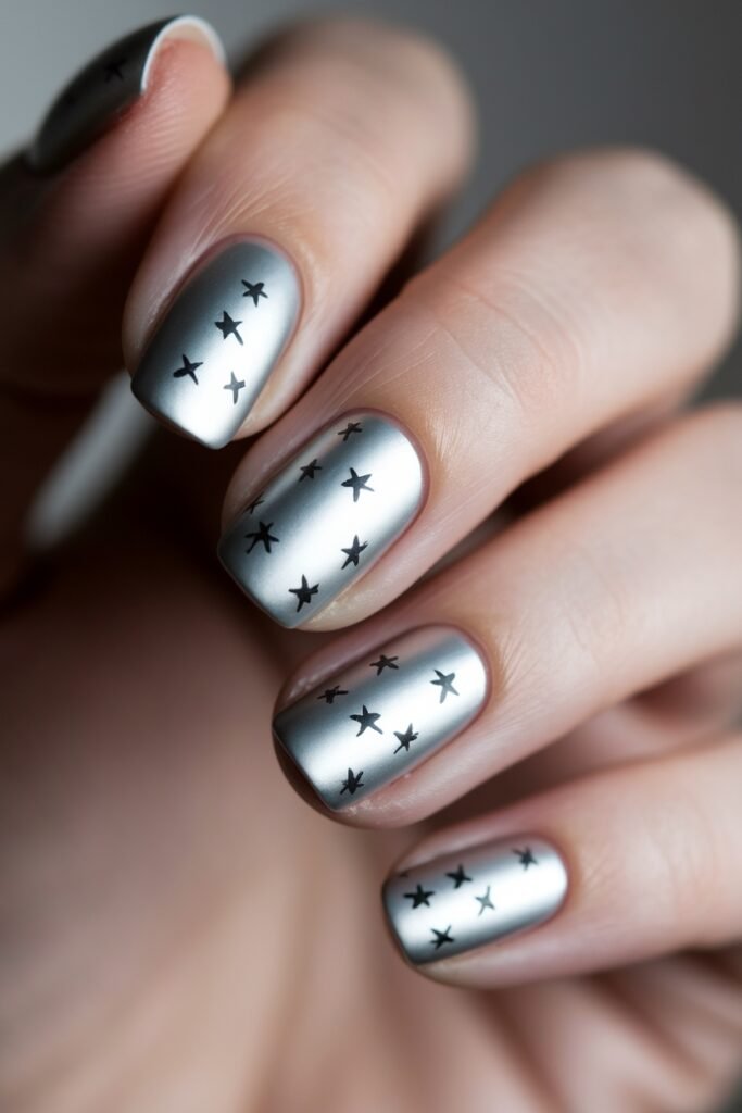 Matte Silver Nails With Black Stars