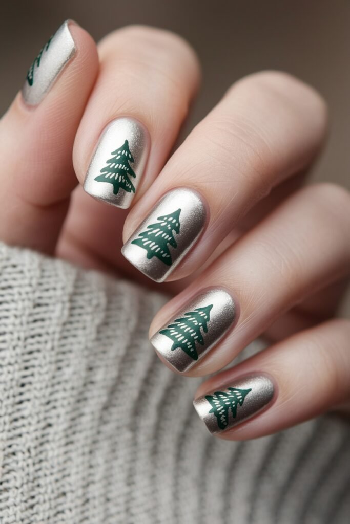 Metallic silver nails with Christmas tree designs