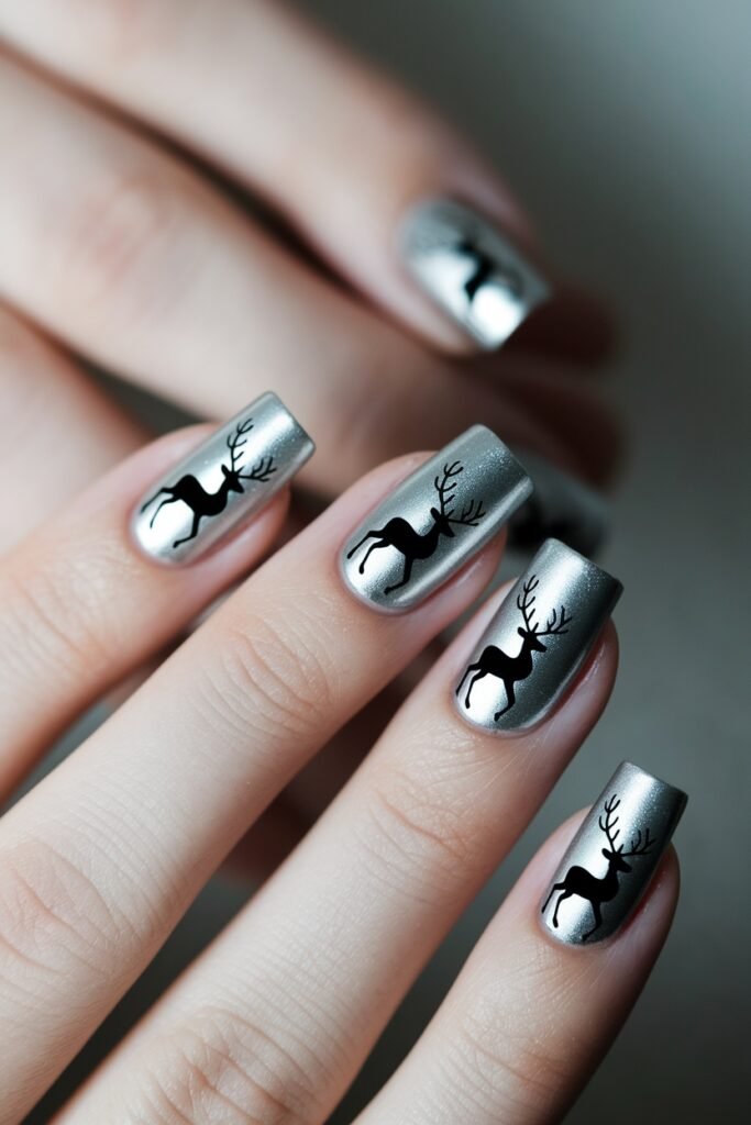 Silver foil nails with reindeer silhouette